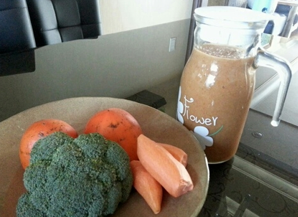 브로콜리, 양배추, 방울토마토, 당근에 물한컵을 붓고 살짝 데친후 믹서기에 갈아서 휴대하기 편한 물통에
